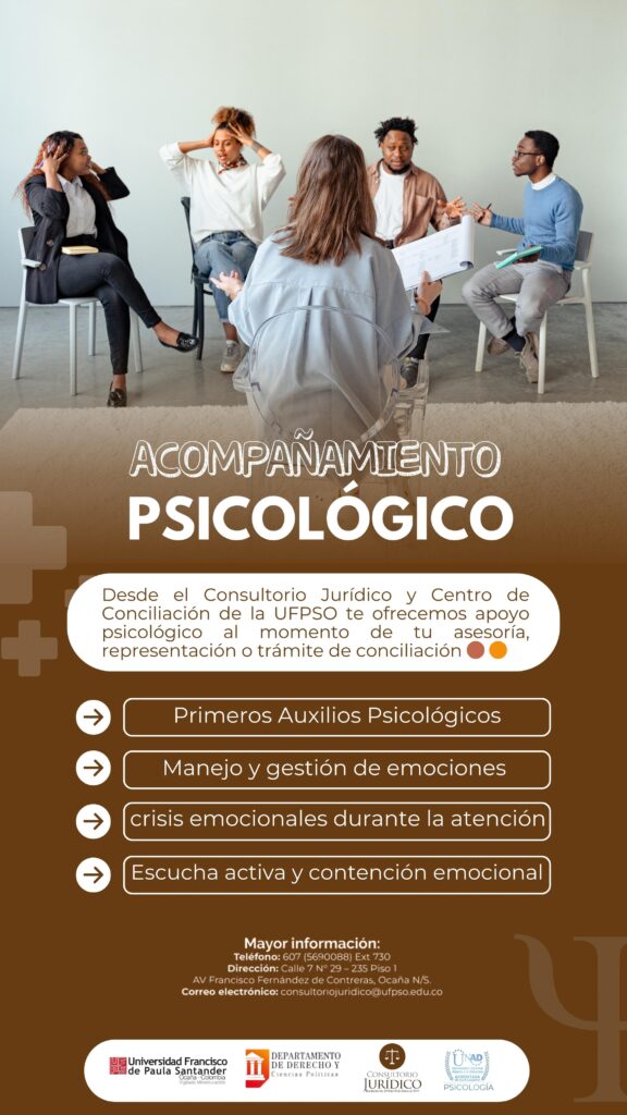 Desde el Consultorio Jurídico y Centro de Conciliación de la UFPSO, ponemos a disposición de nuestros estudiantes, asesores y usuarios un espacio de atención psicológica para brindar apoyo en diversas situaciones.