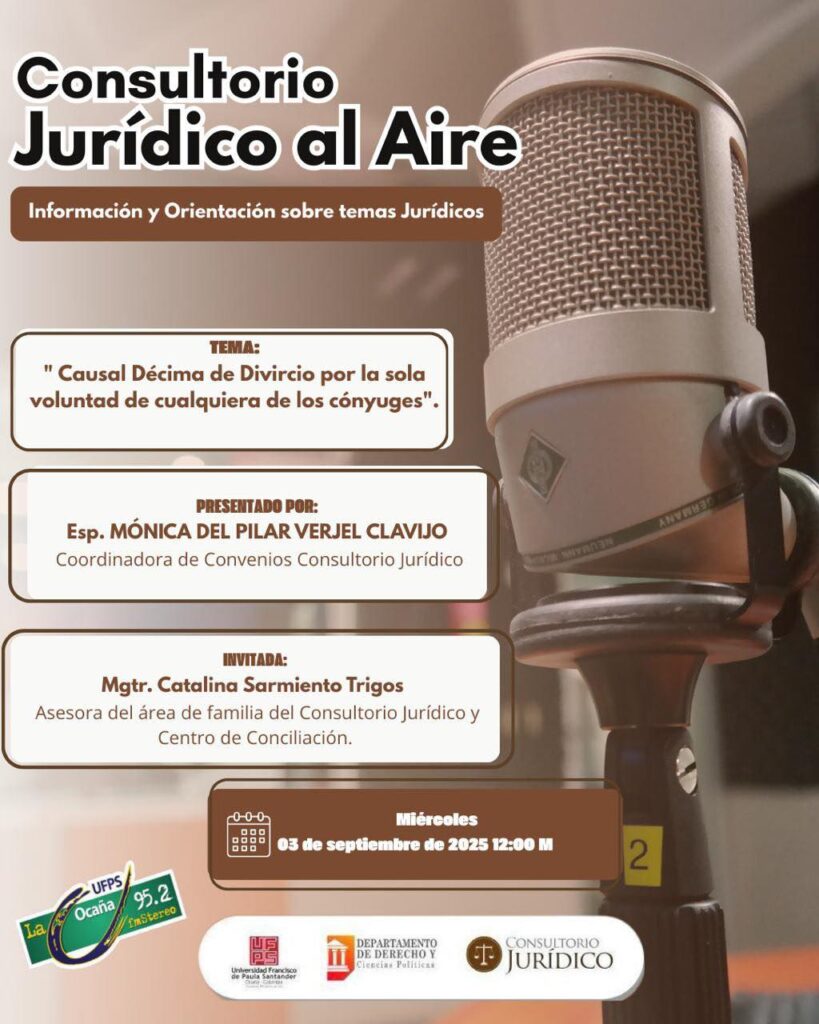 Consultorio Jurídico Al Aire Tema “Causal décima de divorcio por la sola voluntad de cualquiera de los cónyuges”. Deja un comentario Cancelar respuestaTu dirección de correo electrónico no será publicada. Los campos obligatorios están marcados con *Nombre * Correo electrónico * Web Comentario * Guardar mi nombre, correo electrónico y sitio web en este navegador para la próxima vez que haga un comentario. Δ